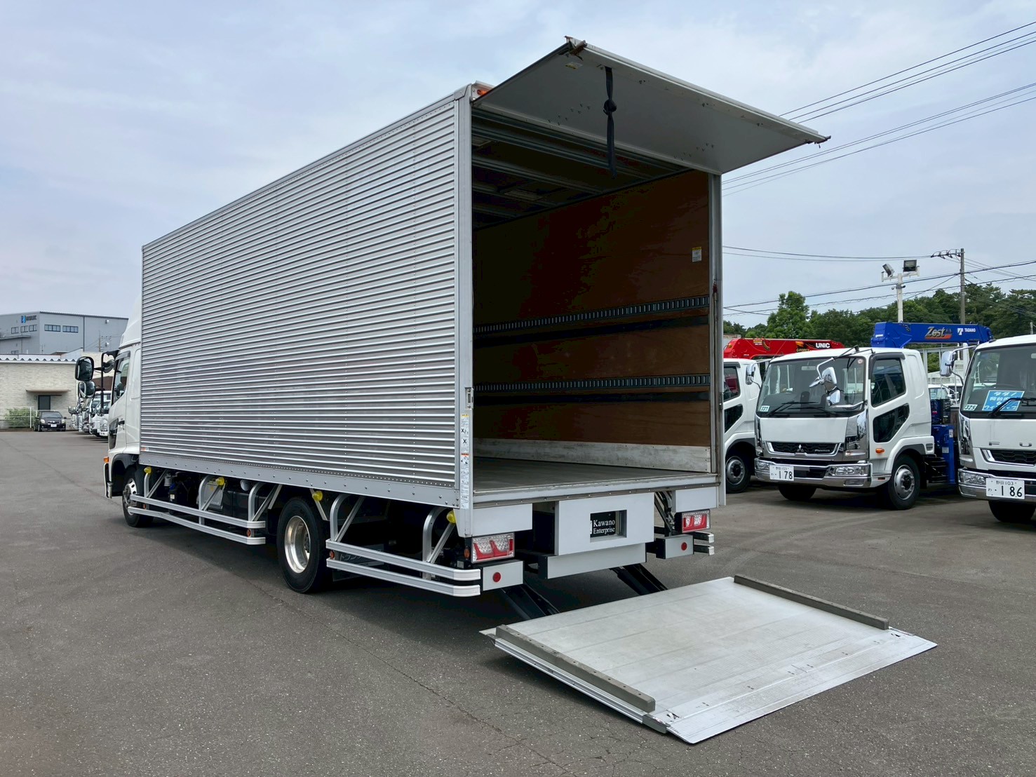ワイド幅、6200ボディ、ハイルーフ、ベッド付き、跳上パワーゲート/極東、床/アルミ、ラッシングレール2段、オートクルーズ、オートハイビーム、衝突被害軽減ブレーキ、車線逸脱警報装置