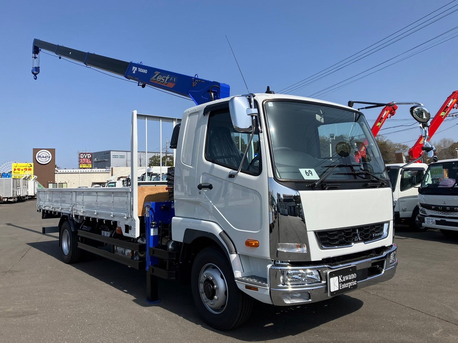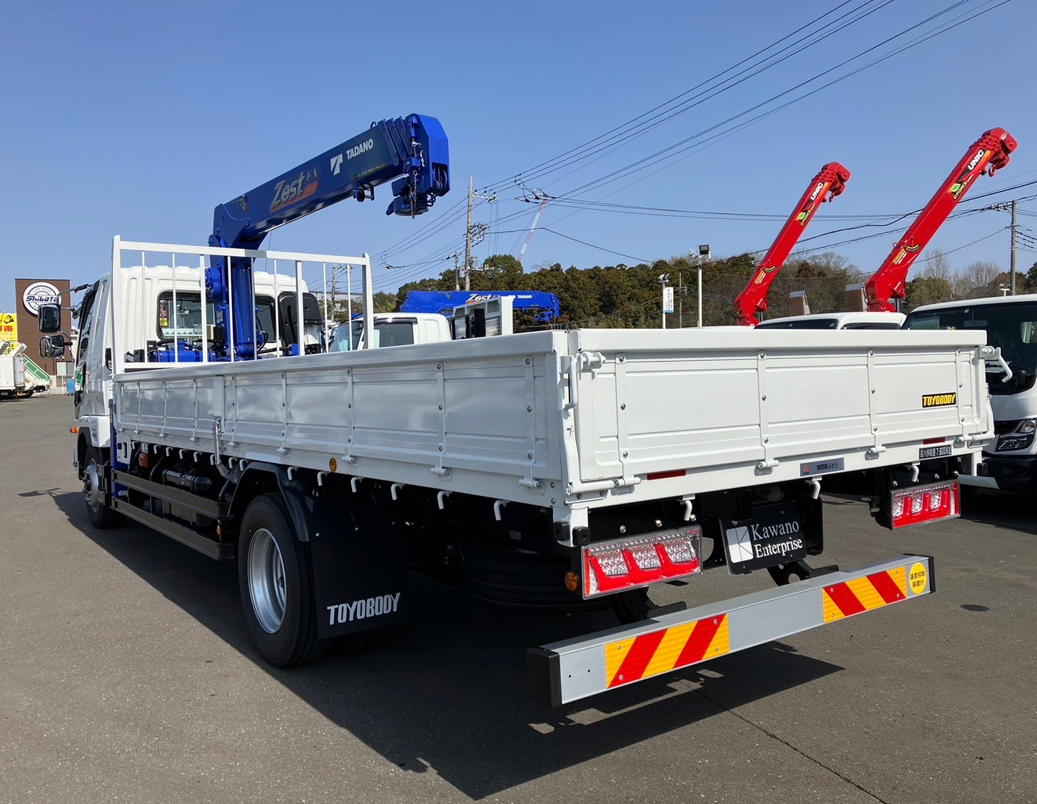 未使用車、増トン、標準幅/6.2mカット、4段クレーン/タダノ、ラジコン、アウトリガ/角足差し違い、セイコーラック、敷板・収納、LEDテールランプ、上物/東洋ボデー