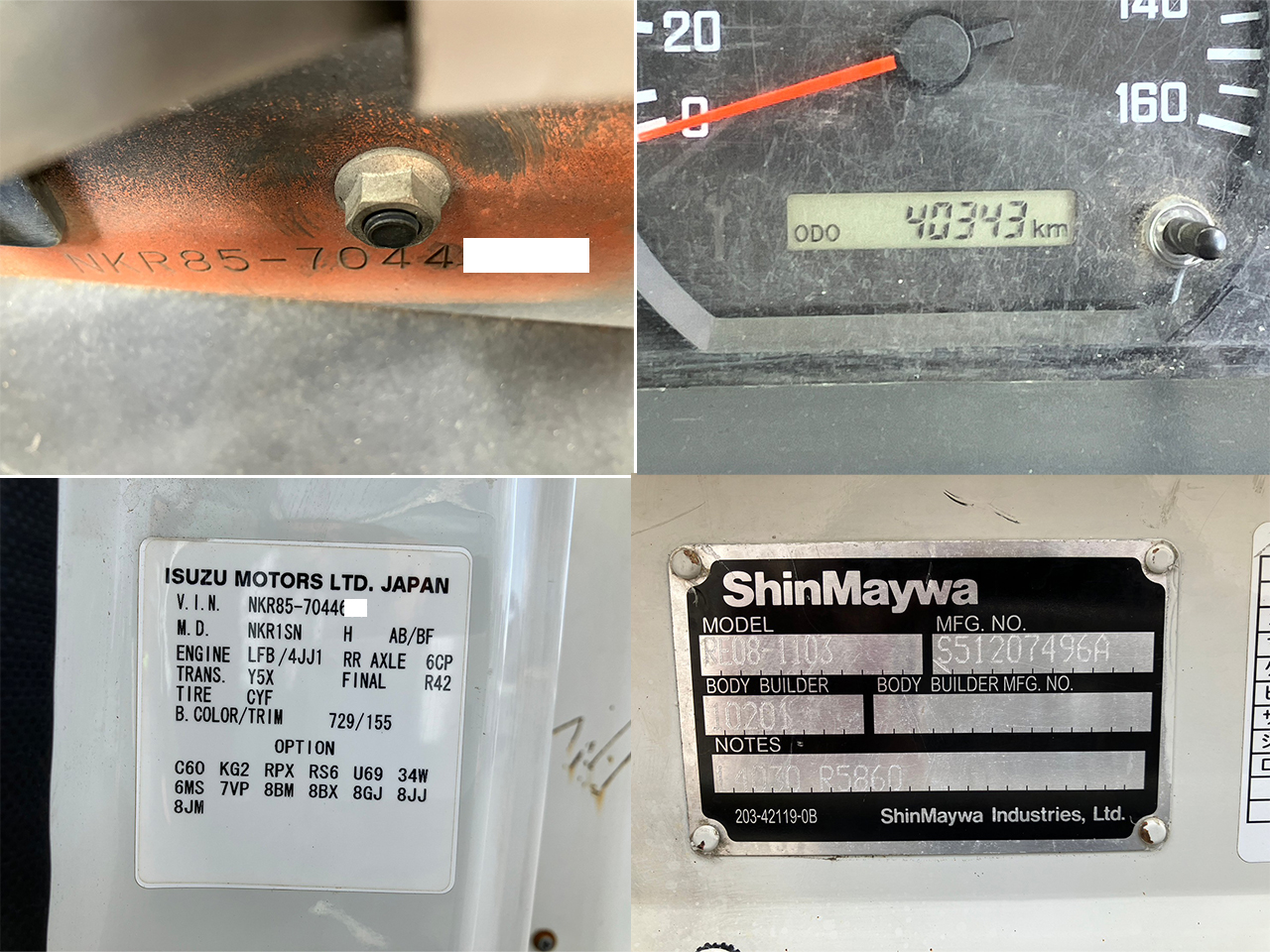 | ※装備・架装・備品などは現車状態での販売です。実際に車両の確認をお勧めしております。 ※キズや凹みなど、画像からは確認出来ない箇所もございますので詳細はお問合せください。 ※新たに車検を受けた際、車両によっては旧車検証記載の内容と異なる場合がございますのでご注意ください。(減トン等) ※レンタカー登録の車両に関して、記載の走行距離(ODOメーター)を超過している場合がございます。  |