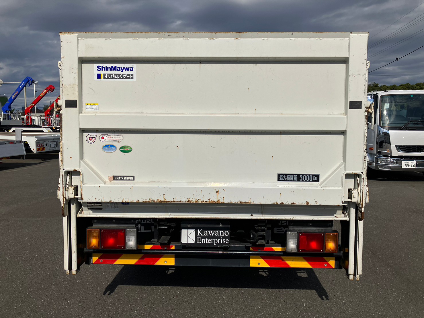 | 〇新明和製/垂直パワーゲート(800kg) 〇ミッション/6MT 〇最大積載量/3,000kg 〇アオリ/木製二段アオリ 〇セイコーラック(アオリ開閉補助装置) |