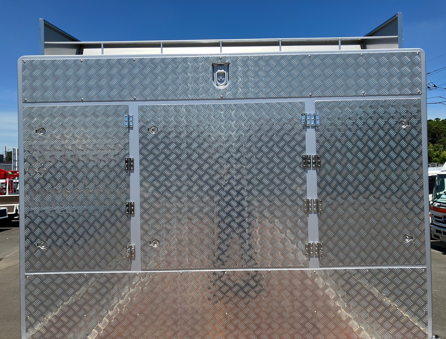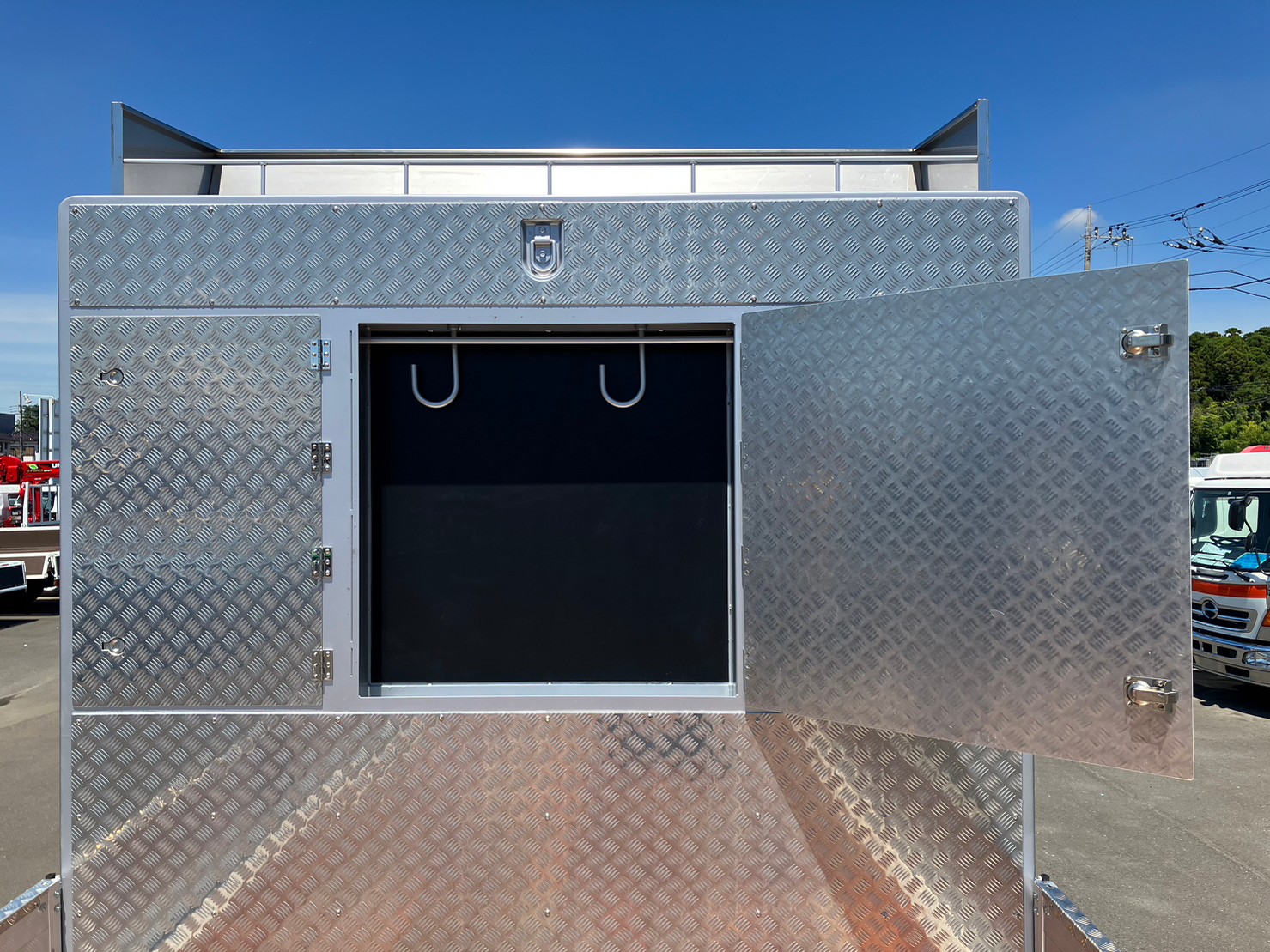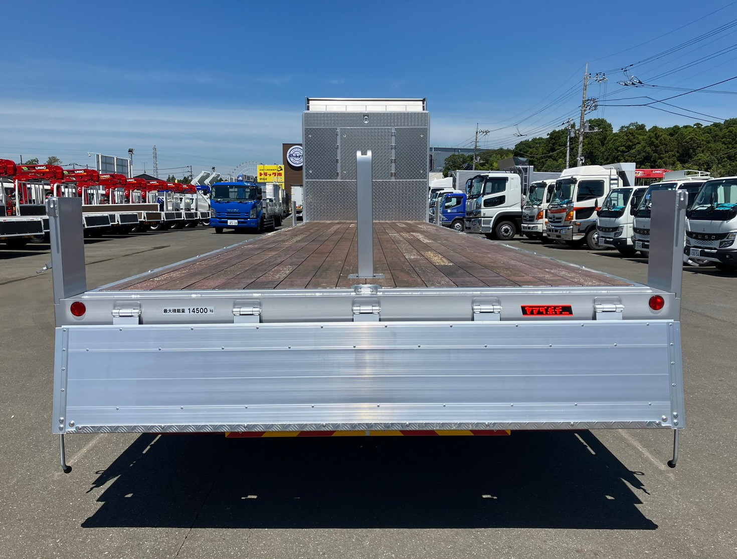 未使用車、4軸/低床、アルミブロック、5方開、鳥居収納/多数、スタンション、ベッド付き、床フック/9対、丸環フック/前後左右各1、LEDテールランプ、アオリ下フック/右17・左22・後4